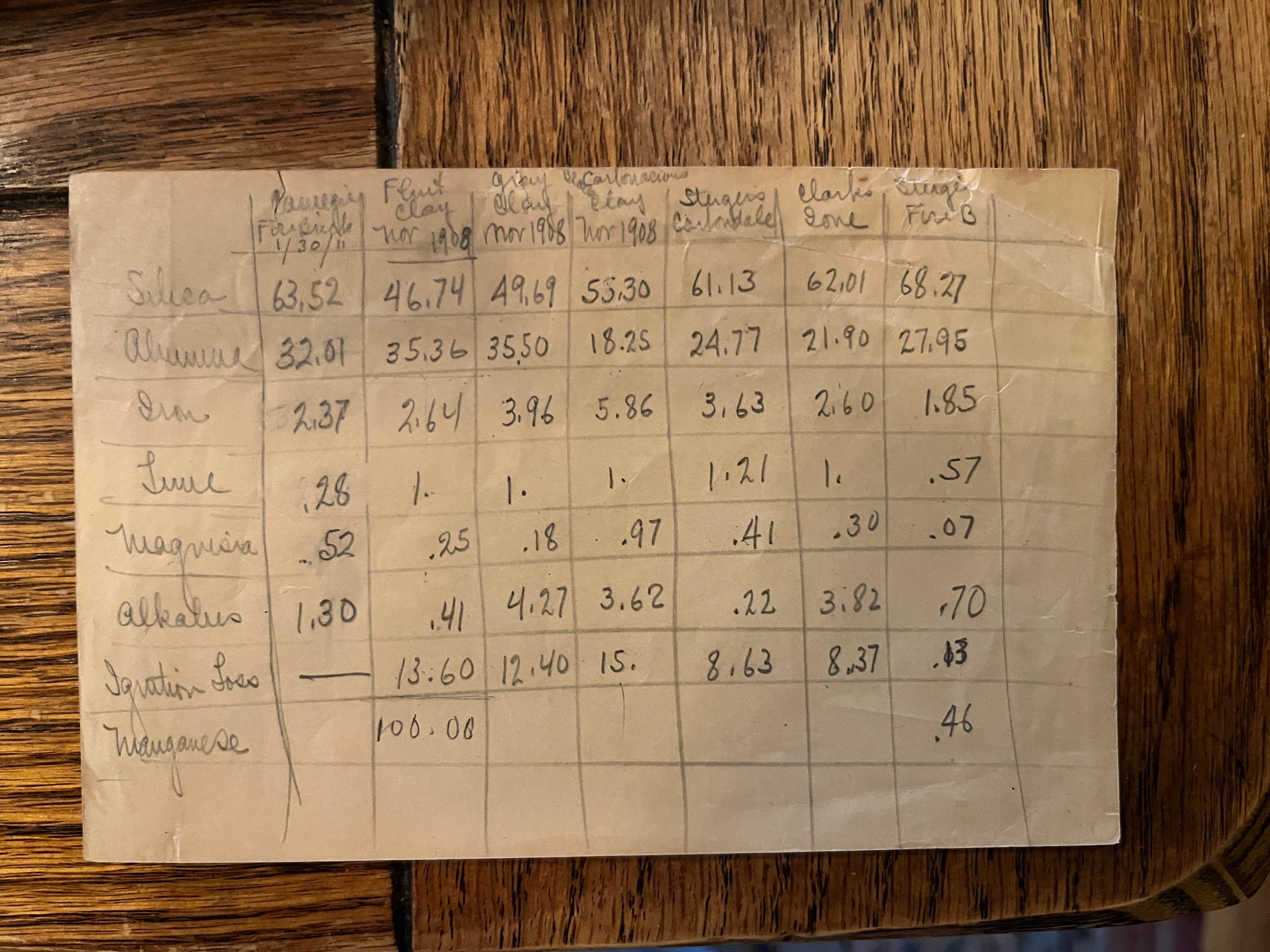 I also went through a box of materials that the current owner of the Keeler family home in South Gate sent me a while back and took photos of everything so I can refer to it without pulling everything out. Some of the materials are very fragile. One piece of particular interest is this table of clays and fluxes (at least I think that’s what they are) and the outcomes, presumably created by Rufus. What do the decimals mean? What was he trying to do? Next time you pick up your coffee mug, think about the science involved in figuring out the precise mixture of clay and flux, the heat of the kiln, and the men and women who figured this shit out just through trial and error.