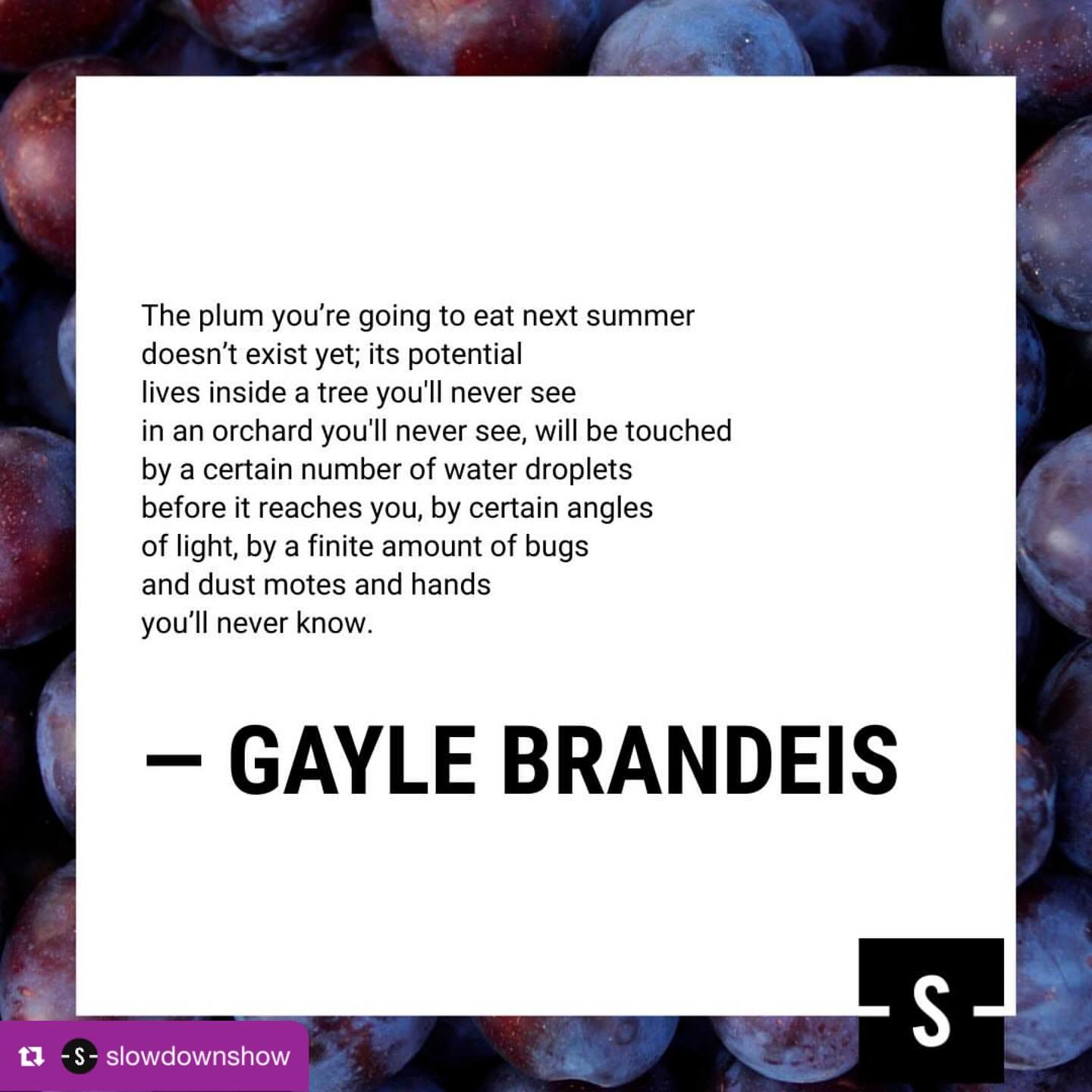 Yesterday, my favorite poetry podcast featured her viral poem “The plum you’re going to eat next summer” so I have to share that here. Click the image to listen to Slowdown host Maggie Smith read Gayle’s poem.